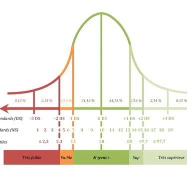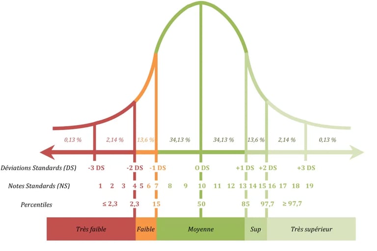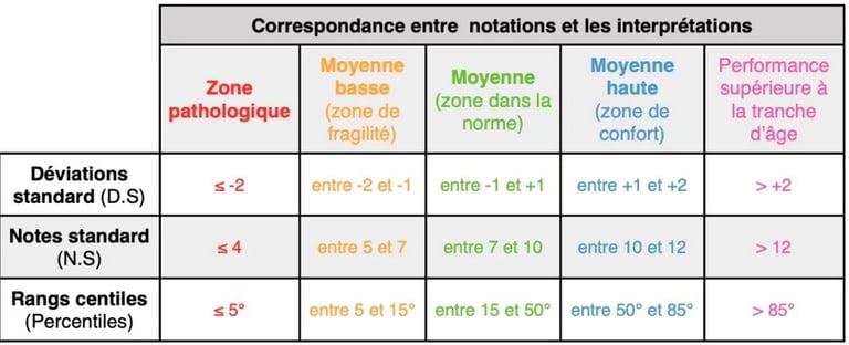 Note standard : le terme de notes standards indique qu’il s’agit de résultats normalisés pouvant permettre la comparaison par rapport à une norme de référence. Ce type de résultat (provenant d’un échantillon statistique) n’est pas comparable avec une note de type résultat scolaire (provenant du barème d’un professeur). A titre d’exemple, une note standard de 11/19 peut sembler un score médiocre pour le « grand public » alors qu’elle correspond en réalité à un résultat tout à fait attendu au regard de l’âge de l’enfant.