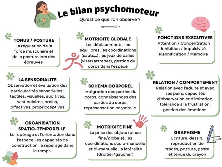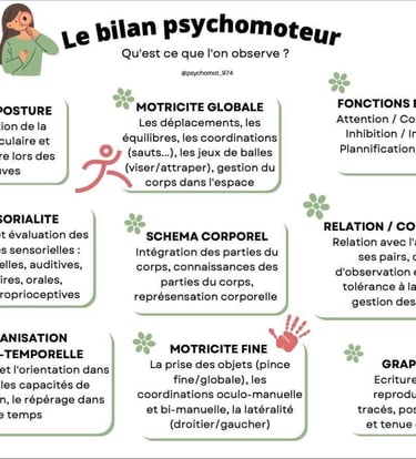 Bilan : il se déroule en général en 2 à 3 séances de 45mn à 1h, selon la fatigabilité et la disponibilité du patient. Au cours de ces séances, des épreuves et tests (standardisés et étalonnés) sont administrés. Ils permettent d’effectuer des observations quantitatives et qualitatives dans les différents domaines psychomoteurs : tonus, latéralité, schéma corporel, motricité globale et fine, graphomotricité, perception, repérage et organisation dans le temps et l’espace, fonctions exécutives (planification, inhibition, flexibilité), mémoire, attention, gestion des émotions et sensorialité.