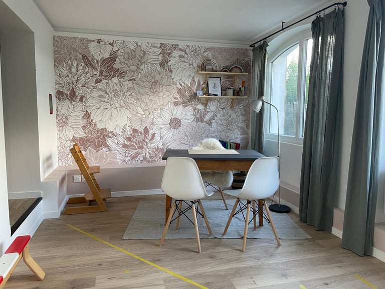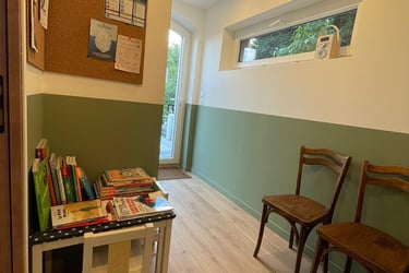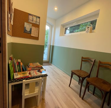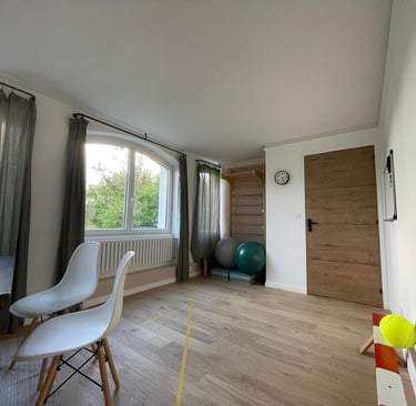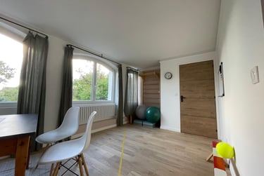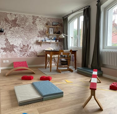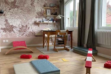 d'une salle de consultation, comprenant une table pour les activités "au bureau" tels que les jeux de société ou les activités de graphisme, un espace sensoriel, un coin "escalade" ainsi que tout l'espace nécessaire pour effectuer des parcours psychomoteurs ou autres activités motrices.